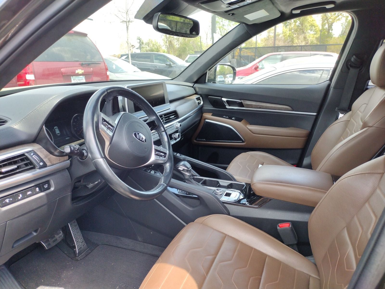 This Telluride SX includes SX Prestige Package (110V Inverter, Heads-Up Display, Heated & Ventilated 2nd Row Seats, Heated Steering Wheel, Nappa Leather Seat Trim, Premium Cloth Headliner & Pillar Trim, and Rain Sensing Wipers), 10 Speakers, 3.648 Axle Ratio, 3rd row seats: split-bench, 4-Wheel Disc Brakes, ABS brakes, Air Conditioning, Alloy wheels, AM/FM radio: SiriusXM, Apple CarPlay & Android Auto, Auto High-beam Headlights, Auto-dimming Rear-View mirror, Automatic temperature control, Brake assist, Bumpers: body-color, Carpeted Floor Mats, Compass, Delay-off headlights, Driver door bin, Driver vanity mirror, Dual front impact airbags, Dual front side impact airbags, Electronic Stability Control, Emergency communication system: 911 Connect, Four wheel independent suspension, Front anti-roll bar, Front Bucket Seats, Front Center Armrest, Front dual zone A/C, Front fog lights, Front reading lights, Fully automatic headlights, Garage door transmitter: HomeLink, Heated & Ventilated Front Bucket Seats, Heated door mirrors, Heated front seats, Heated steering wheel, Illuminated entry, Knee airbag, Leather Shift Knob, Leather steering wheel, Leather-Trimmed Upholstery, Low tire pressure warning, Memory seat, Navigation System, Occupant sensing airbag, Outside temperature display, Overhead airbag, Overhead console, Panic alarm, Passenger door bin, Passenger vanity mirror, Power door mirrors, Power driver seat, Power Liftgate, Power moonroof, Power passenger seat, Power steering, Power windows, Radio data system, Radio: AM/FM/MP3/SiriusXM Audio System, Rear air conditioning, Rear anti-roll bar, Rear audio controls, Rear reading lights, Rear window defroster, Rear window wiper, Reclining 3rd row seat, Remote keyless entry, Roof rack: rails only, Security system, Speed control, Speed-sensing steering, Split folding rear seat, Spoiler, Steering wheel mounted audio controls, SX Dune Brown Nappa Leather Seats, Tachometer, Telescoping steering wheel, Tilt steering wheel, Traction control, Trip computer, Turn signal indicator mirrors, Variably intermittent wipers, Ventilated front seats, and Wheels: 7.5 x 20 Black Finish Sport Alloy . While every effort has been made to ensure display of accurate data, the vehicle listings within this web site may not reflect all accurate vehicle items. All Inventory listed is subject to prior sale. The vehicle photo displayed may be an example only. Pricing throughout the web site does not include any options that may have been installed at the dealership. Please see the dealer for details. Vehicles may be in transit or currently in production. Some vehicles are shown with optional equipment. See the actual vehicle for complete accuracy of features, options & pricing. Because of the numerous possible combinations of vehicle models, styles, colors and options, the vehicle pictures on this site may not match your vehicle exactly; however, it will match as closely as possible. Some vehicle images shown are stock photos and may not reflect your exact choice of vehicle, color, trim and specification. Not responsible for pricing or typographical errors. Virtual Inventory, Available Configurations and In-Transit inventory contains vehicles that have not actually been manufactured. These vehicles show consumers sample vehicles that may be available. Pricing, Options, Color, and other data pertaining to these vehicles are provided for example only. All information pertaining to these vehicles should be independently verified through the dealer.
